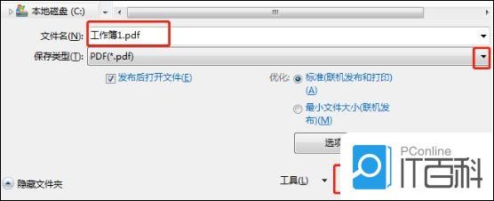 2.在弹出的对话框中找到保存类型选择PDF格式,点击发布。如图所示。