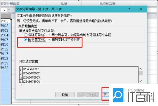 3.在分列的第1步里,勾选【固定宽度】,然后点击【下一步】,(如下图红色圈出部分所示)。