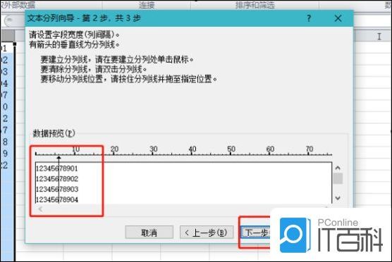 4.在分列的第2步里,在要分列的地方建立分列线,点击一下鼠标左键则可建立分列线,然后点击【下一步】,(如下图红色圈出部分所示)。