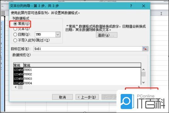 5.在分列的第3步里,格式默认常规则可,然后点击【完成】,(如下图红色圈出部分所示)。