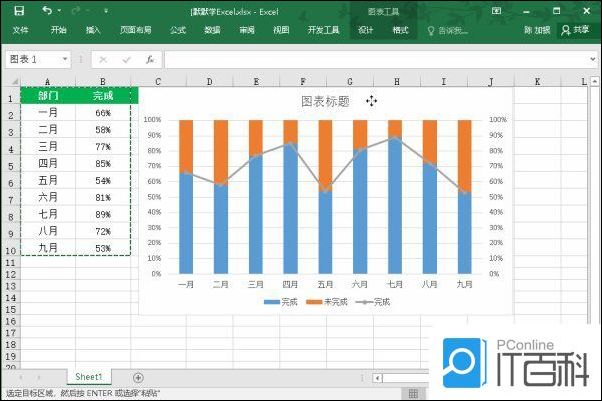1.选中所有数据,插入「百分比堆积柱形图」。然后,选中“完成”这列的数据,将其复制一下,选中整个图表将其粘贴进去。
