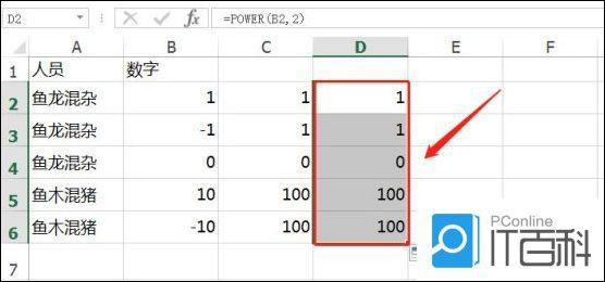 2.按下回车,往下填充公式,同样能得到数字的平方数,如下图所示。
