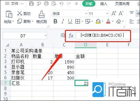 2.选定单元格,在D7单元格里输入=sum(B3:B6*C3:C6)。