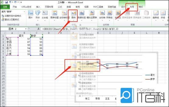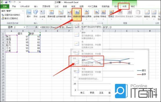 4.选中图表中的一条折线,点击上方的【布局】按钮,选择【数据标签】,最后在选择显示位置,这里选择的上方,如下图红色圈出部分所示: