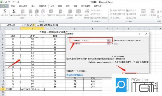 5.在参数1中选中所有语文成绩,这里是【B3:B20】,再点击【确定】,如下图红色圈出部分所示: