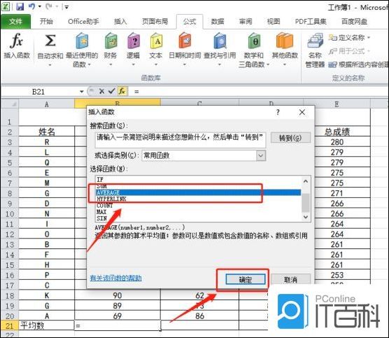 4.在弹出的弹框里边找到AVERAGE函数,点击【确定】,如下图红色圈出部分所示: