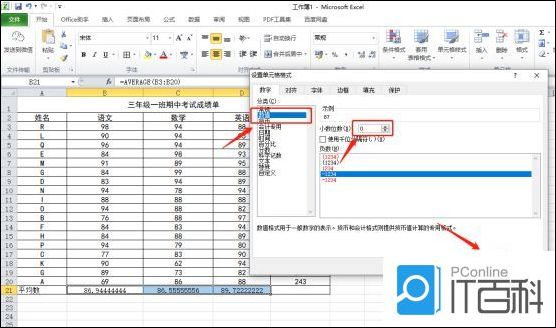 7.想把平均数保留成整数:选中单元格单击鼠标右键,选择【设置单元格格式】,小数位数改成0,点击确定,如下图所示: