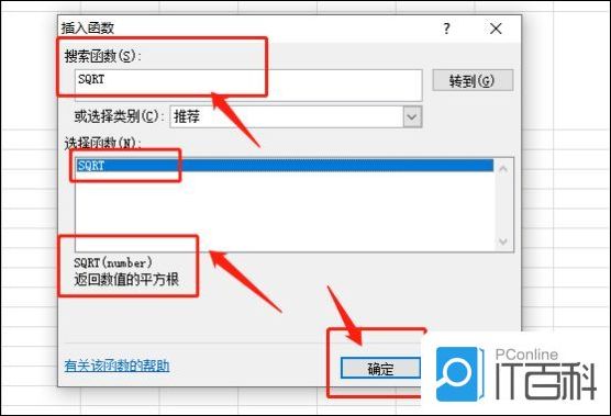 4、然后,在【插入函数】的对话框中找到【SQRT】的函数;如果忘了函数的意思,可以在下方看到解释说明。