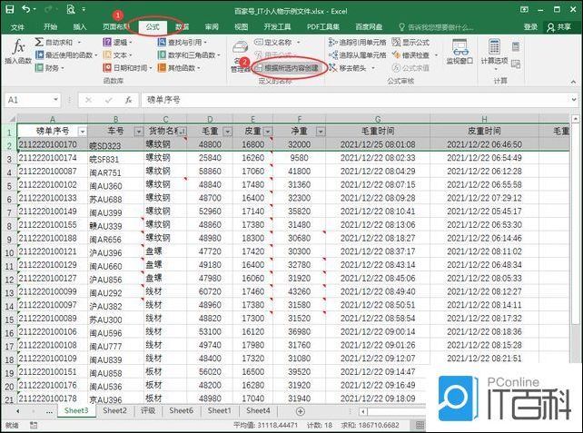 3、依次点击菜单项【公式】-【根据所选内容创建】;
