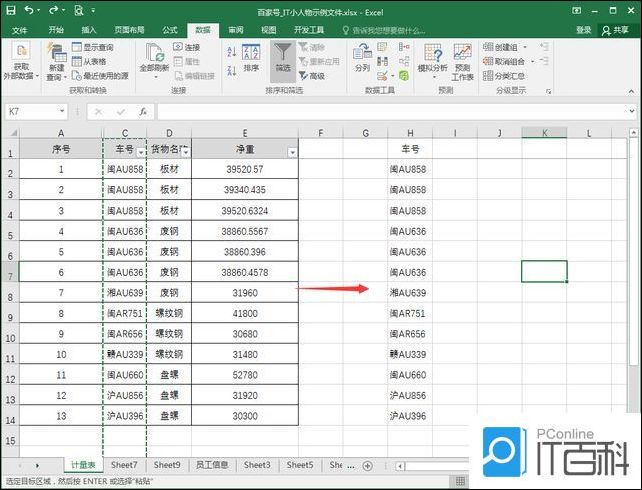 1、以下图中的表格数据为例,介绍如何统计车号列中不重复车号的个数;