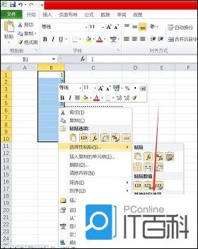 3、再框选你要讲数值乘以的那一列数据,然后单击鼠标右键,在“选择性粘贴”的下拉菜单中选择“选择性粘贴”。