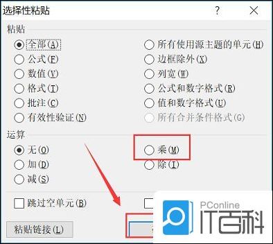 4、弹出选择性粘贴的界面,在该界面的运算一栏下选择“乘”,然后点击“确定”。