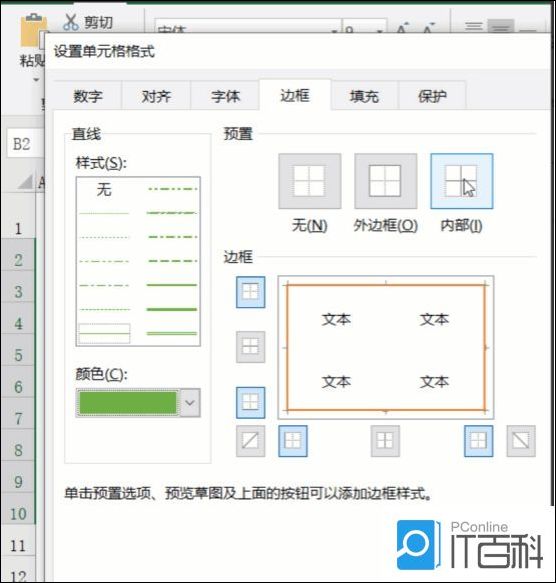 选中需要添加边框的单元格区域B2:H10,按Ctrl+1键调出设置单元格格式对话框;在设置单元格格式窗口中选择【边框】页面,可以选择直线样式、颜色等,这里先选择一个较粗线条,颜色选择橙色,点击【外边框】,再选择一个较细线条,颜色选择绿色,点击【内部】按钮,最后点击【确定】返回工作区,这样表格外边框为加粗橙色,内边框较细为绿色。