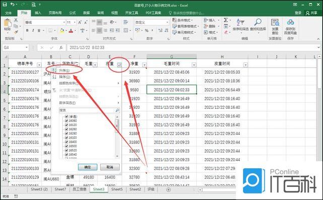 3、当表格标题行调出筛选按钮,也可以进行排序的操作;