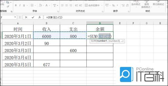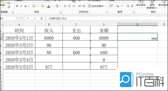 4、在余额的后面一格输入=SUM(B$2:B2)这个公式意思就是求和第三行B3列的,往下拉就可以看到所有的累计求和。