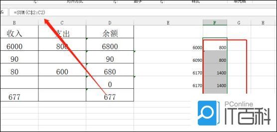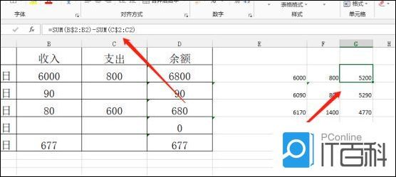 5、同样,计算累计支出,第一个输入=SUM(C$2:C2)往下拉就可以将支出累计求和算出来。