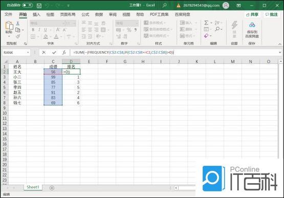 在函数处选择=SUM(--(FREQUENCY(C$2:C$8,IF(C$2:C$8>=C2,C$2:C8))>0))