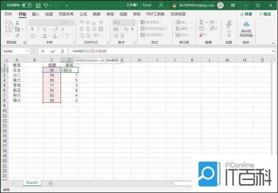 看好数据(如图成绩在C2-C8),然后输入第一个参数我们填C2,第二个参数则要选择所有数据(如图形式填写),第三则是顺序,0为降序,为是升序。(这里为成绩所以选降序。)
