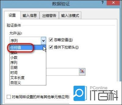 7.在弹出的“数据验证”对话框中找到“验证条件”的“允许”,点击下拉菜单,选择“任何值”选项,如图所示。