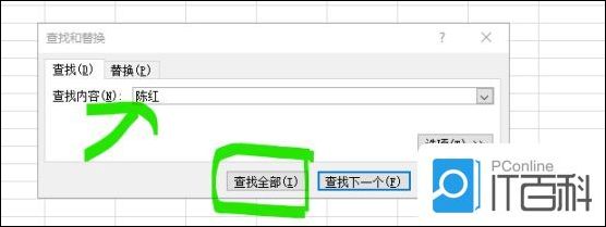 然后在查找内容栏输入”陈红“,然后点击”查找全部“