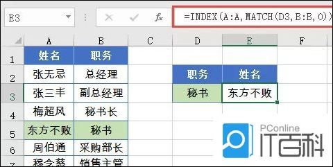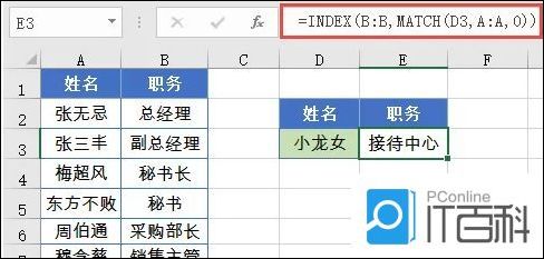 如下图所示,要根据D3单元格中的职务,在A~B列查询对应的姓名。
