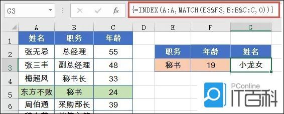 如下图所示,需要根据E列和F列的职务和年龄信息,在A~C列单元格区域中,查找职务为“秘书”,年龄为“19”岁所对应的姓名。