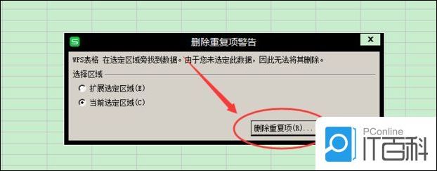 7、此时会弹出一个提示框,选择“当前选定区域”并点击“删除重复项”。