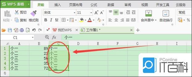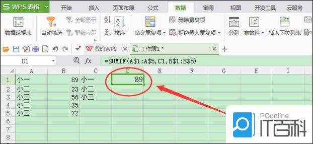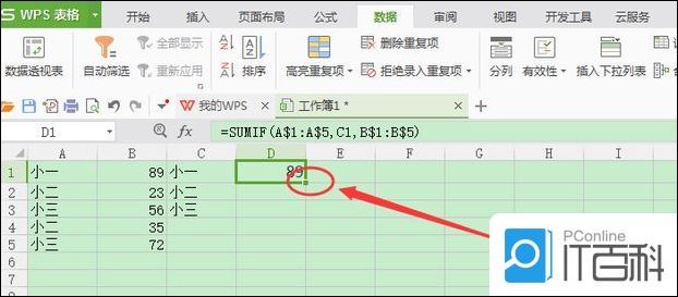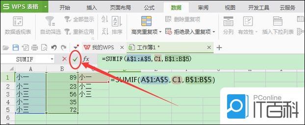 11、后在上方的函数框中输入“=SUMIF(A$1:A$5,C1,B$1:B$5)”。其中A1、A5代表要被合并同类项的字符串所在单元格的范围,B1.B5代表要被求和的数据所在单元格的范围,C1代表目前要被求和的数据所对应的字符串。
