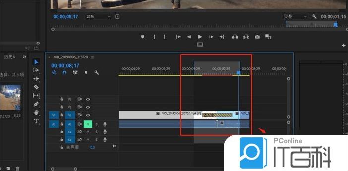 5、 在过渡之前的位置按I键设置入点 ,然后在过渡后的位置按O键设置出点。
