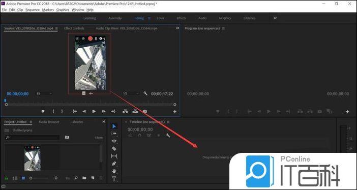 3、接着,我们将导入的视频从源文件框拖拽到 时间轴 框,如下图所示。视频加入 时间轴 方框后方可编辑