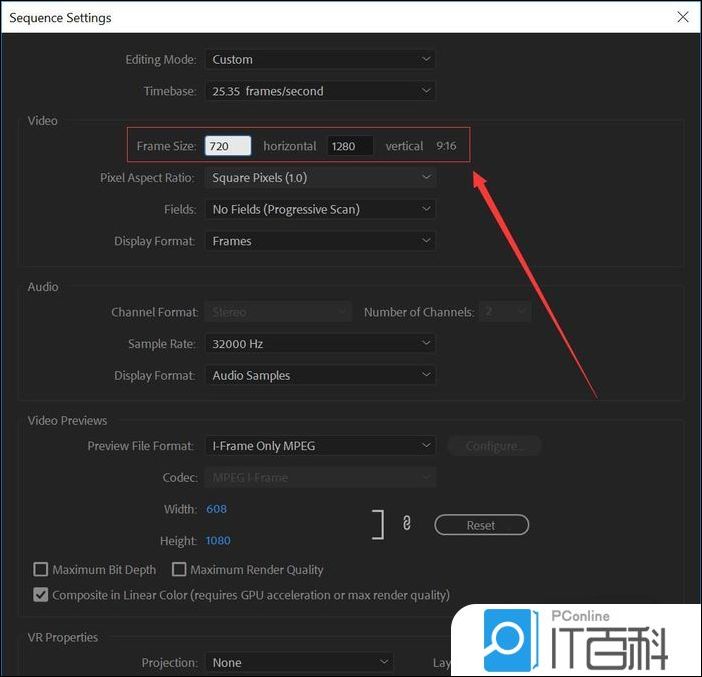 7、在序列设置菜单中, 将帧大小文本框 中的水平和垂直数值交换一下,例如 720*1280 的原数值视频旋转后就应该为 1280*720