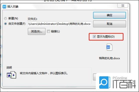 第五步文件名显示出word文件的路径之后,需要勾选“显示为图标”,可以预览到样式效果,如下图所示: