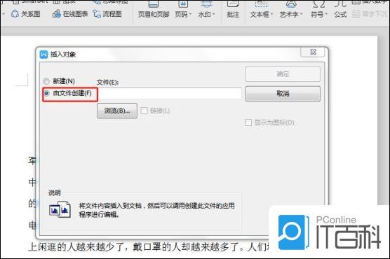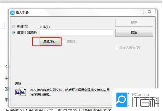 第二步进去对象界面之后,默认是新建,点击由文件创建,点击浏览,选择要插入的word文件,如下图所示: