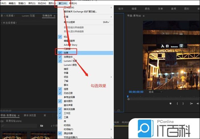 3、选择 窗口菜单栏 ,点击展开 窗口菜单栏 ,勾选显示“ 效果 ”窗口。