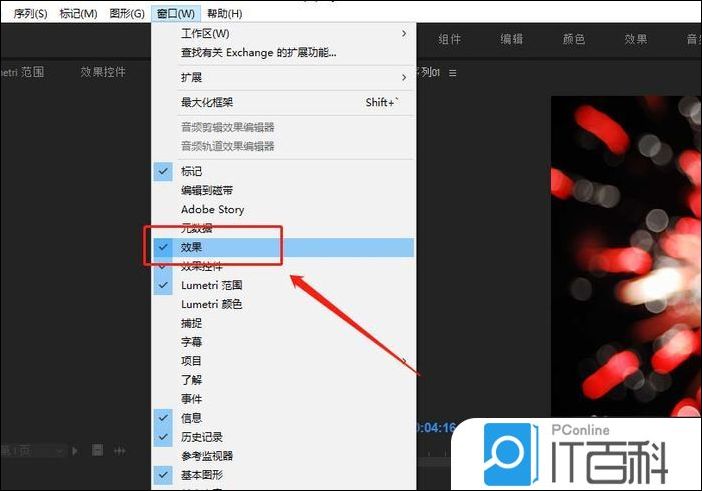3、在PR菜单栏中找到窗口菜单,单击 展开窗口菜单栏 ,在窗口菜单栏中勾选显示“ 效果 ”窗口。