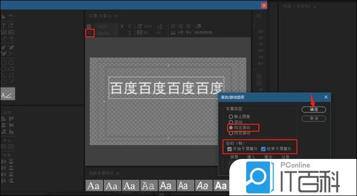 5、弹出字母对话框确定后,输入字幕,如:百度百度百度,点击 字幕滚动/游动选项 ,选择“ 向左游动 ”,“ 定时(帧)”下都打勾 ,并确定,如图