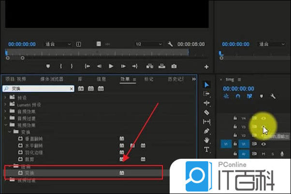 3、然后我们在【 效果】 中选择【 变换 】功能添加给V2轨道的图片素材。