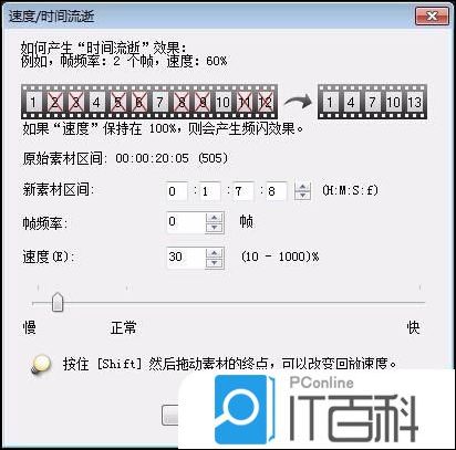 2、如果选择“ 变速 ”,在弹出的对话框中,拉动滑块向快的方向即右侧滑动,然后自己把握好速度即可。