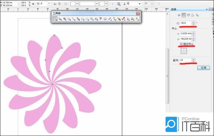 6、将图形的相对中心点移到最下方的那个节点上,调整旋转角度,在“相对中心”上打勾。在副本上填出自己想要复制出来的数量。点击应用。