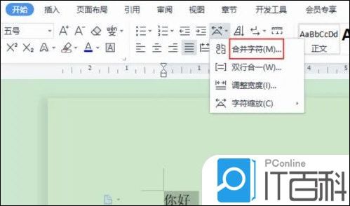 2、在“开始”选项卡下,点击“中文版式”-“合并字符”。