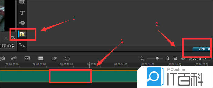 2、添加视频后,左键 点击FX , 然后再用左键点击一下视频,最后点击选项,( 或者点击FX后,直接双击视频轨,的视频 ),如图所示