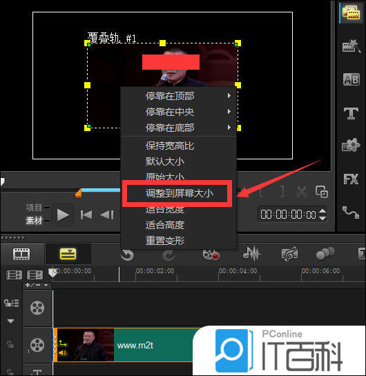 4、点击变形素材后,将鼠标移动到视频画面显示处,点击右键,选 择调整到屏幕大小,