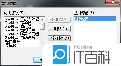 2、双击音频文件,在弹出的“音乐和声音”选项中,选择“音频滤镜”,在弹出滤镜设置对话框中选中“删除噪音”,然后单击“添加”按钮,将滤镜添加到右侧列表框内。