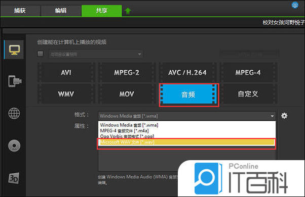 1、把视频导入到会声会影打开,直接点击右上角的分享,选择音频,下拉框中把格式改为wav ;