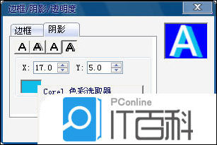 五、单击“边框阴影透明度”按钮,弹出对话框,切换至“阴影”选项卡,单击“突起阴影”按钮,设置“X”参数为17.0,“Y”参数为5.0,并单击“突起阴影色彩”颜色块,选择“蓝色”,然后单击“确定”按钮完成设置。