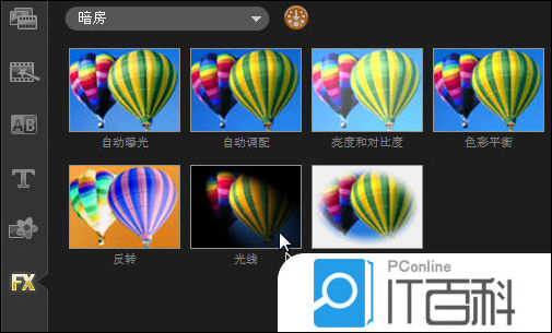六、单击“滤镜”按钮,进入“滤镜”素材库,在“暗房”中选中“光线”滤镜,并将其拖到标题轨的素材中。