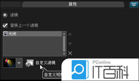 七、展开“选项”面板,切换至“属性”选项卡,选中“滤镜”复选框,单击“自定义滤镜”按钮。