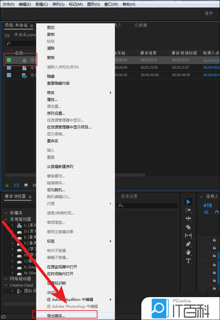 1、渲染设置:在 目标序列 上右键—— 导出媒体 (或者Ctrl+M)。