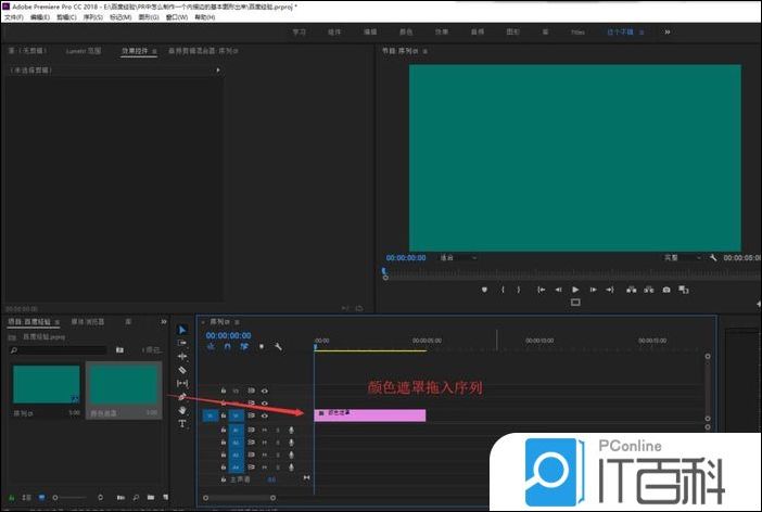 3、将创建的颜色遮罩素材拖到序列 时间轴 的视频轨道上,这样颜色遮罩就作为PR整个项目的背景颜色出现。