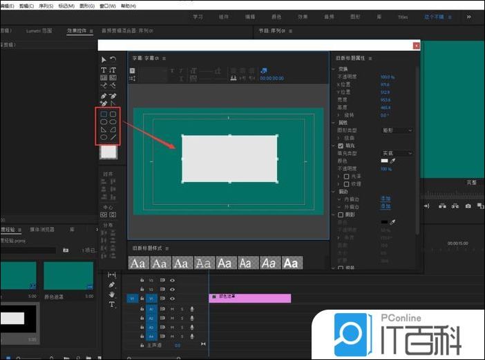 5、新建一个字幕,打开旧版标题窗口,在旧版标题窗口中使用基本图形工具绘制一个基本图形出来。这里绘制的是一个矩形。